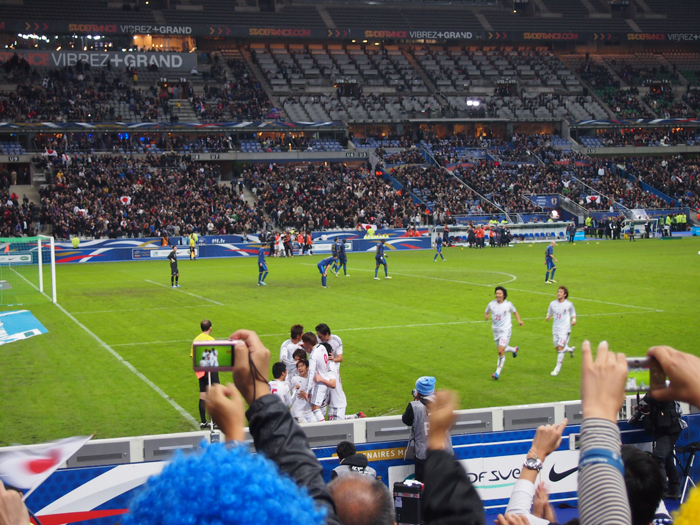 前半押され気味だった日本も、後半はまさかまさかの得点!フランスの応援に負け気味だった日本もこのときは大盛り上がり。1−0の勝利。いい試合だったな〜!