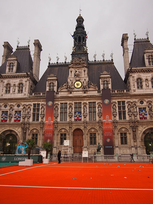 そして、全仏オープンテニスといえば、期間中はパリのド真ん中にも真っ赤なコートが出現していました。全体を写した写真がないのが残念ですが、コートは2面?4面?あって、そこでテニスをする人もいれば(もちろん誰でもOK)、試合中継の巨大スクリーンを見て観戦している人がいたり、ただぼーっと座っている人もいる、とにかく自由で楽しい空気が漂っていました。市庁舎という公共スペースの前で、こんな大胆なことをするフランス人はさすがです。一見アホに見えることも、遊び心ある演出で楽しんで全力でやってのけてしまうところは、フランス人の尊敬するべきところです。